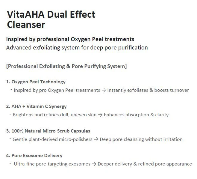 Dr.nineteen PoreXsome VitaAHA Dual Effect Cleanser is a multi-functional facial cleanser designed to deeply cleanse pores while gently exfoliating for smoother, clearer skin.