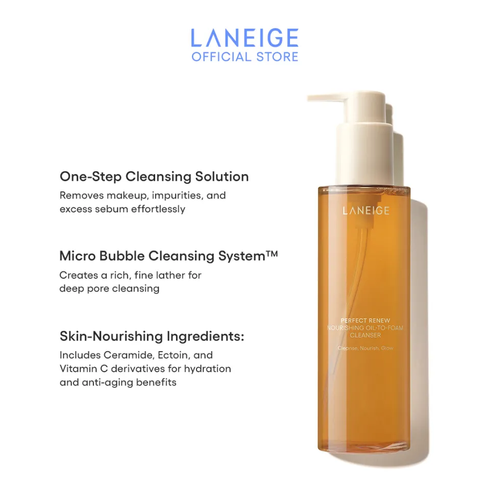 The Laneige Perfect Renew Nourishing Oil to Foam Cleanser is an innovative dual-texture facial cleanser that transforms from a nourishing oil into a rich foam, delivering thorough cleansing while preserving skin moisture and elasticity.