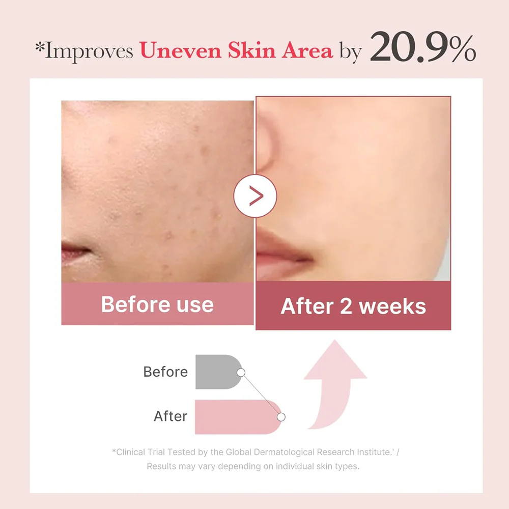 The serum features a lightweight, ampoule-like texture that absorbs quickly and layers easily under skincare and makeup. Its natural pink hue comes from the formula itself, with no artificial color added.