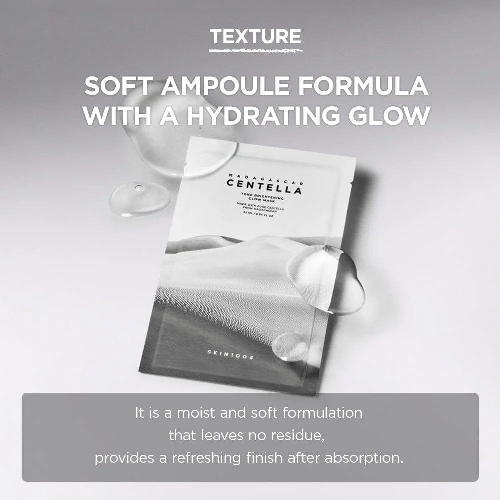 SKIN1004 Tone Brightening Glow Mask is a radiance-boosting sheet mask designed to visibly brighten dull skin and enhance natural glow. Infused with skin-soothing Centella Asiatica and brightening actives, this mask helps improve uneven tone, hydrate deeply, and restore a fresh, healthy-looking complexion. Perfect for quick skin revival, it delivers instant glow with a calm, comfortable feel.